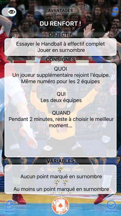 Un jeu de carte, avec un tirage au sort pour pimenter le jeu du HandBall! Les cartes donnent du pouvoir à certains joueurs et des contraintes aux autres.
