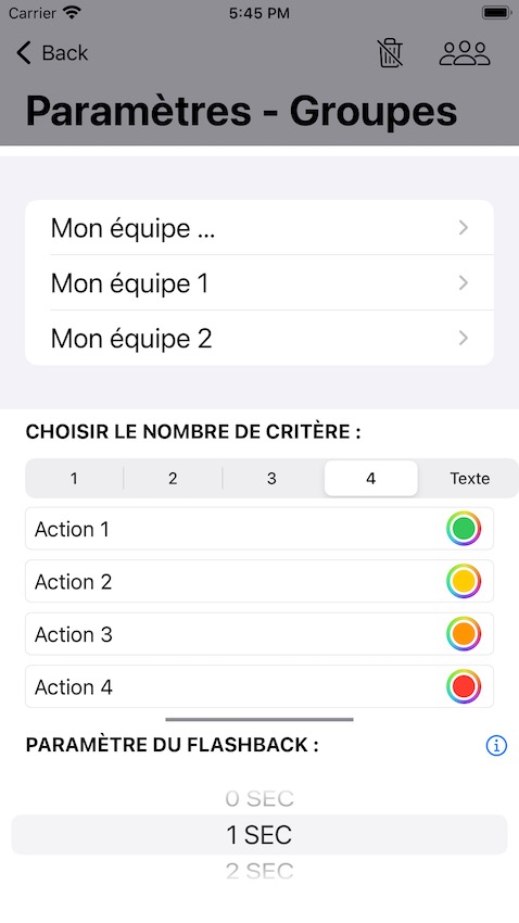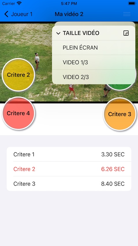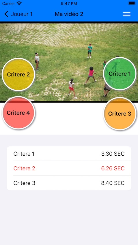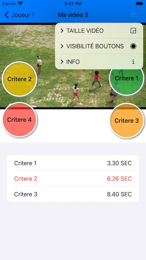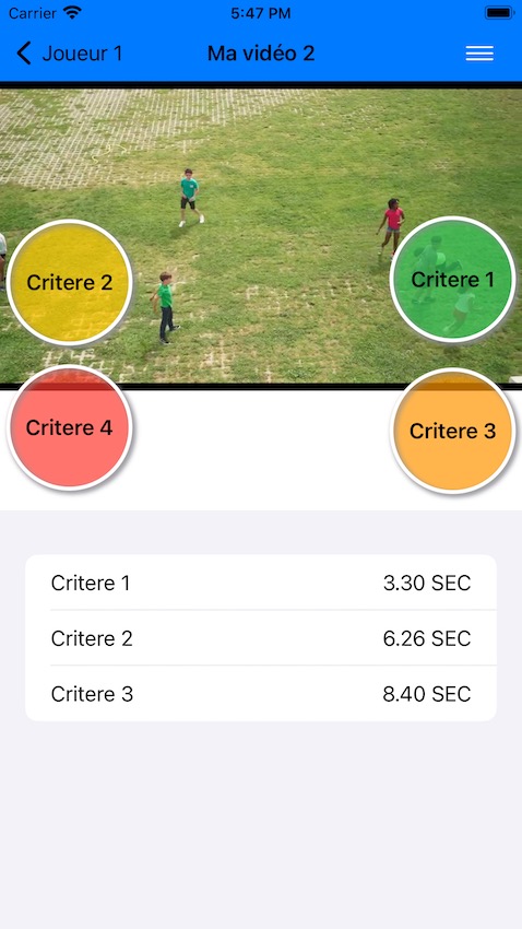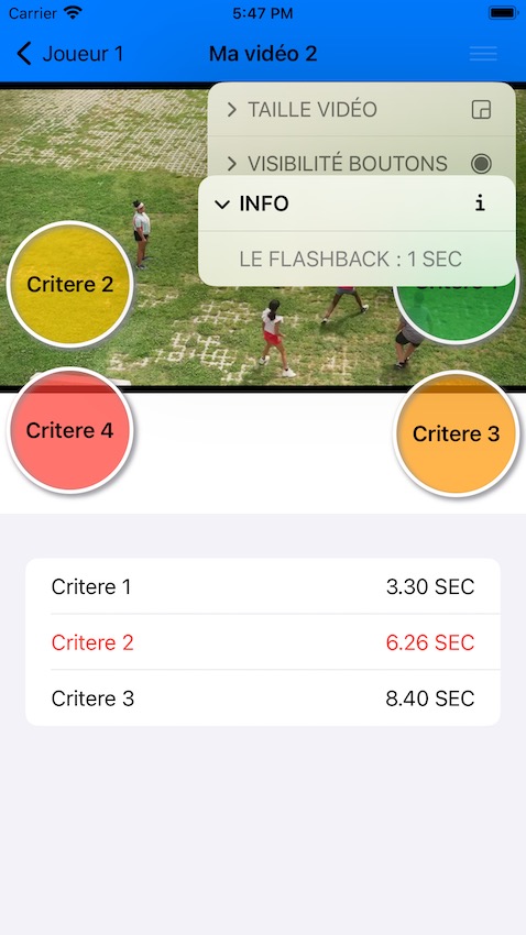 À noter, vous pouvez sélectionner jusqu’à 4 critères personnalisables. De plus, vous pouvez utiliser la fonctionnalité « Texte » qui vous permet de caractériser « l’instant clé » après chaque sélection. L’intérêt de cette application réside dans un feed-back vidéo où il y a un gain de temps non négligeable pour retrouver les séquences ciblées par la leçon.